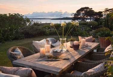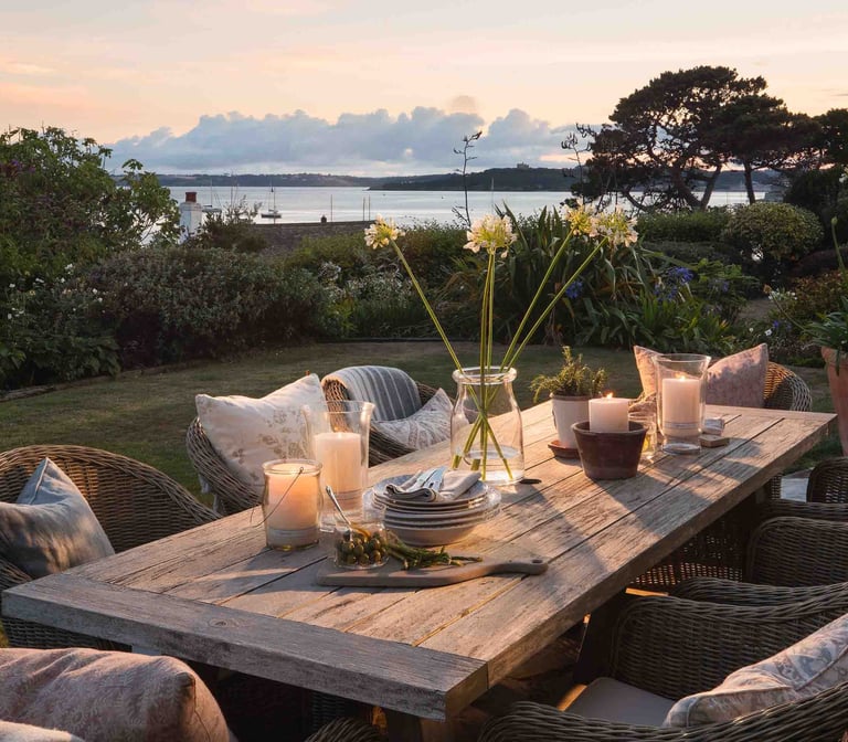 Finish the look with lanterns and light blue cushions for a fresh seaside aesthetic.