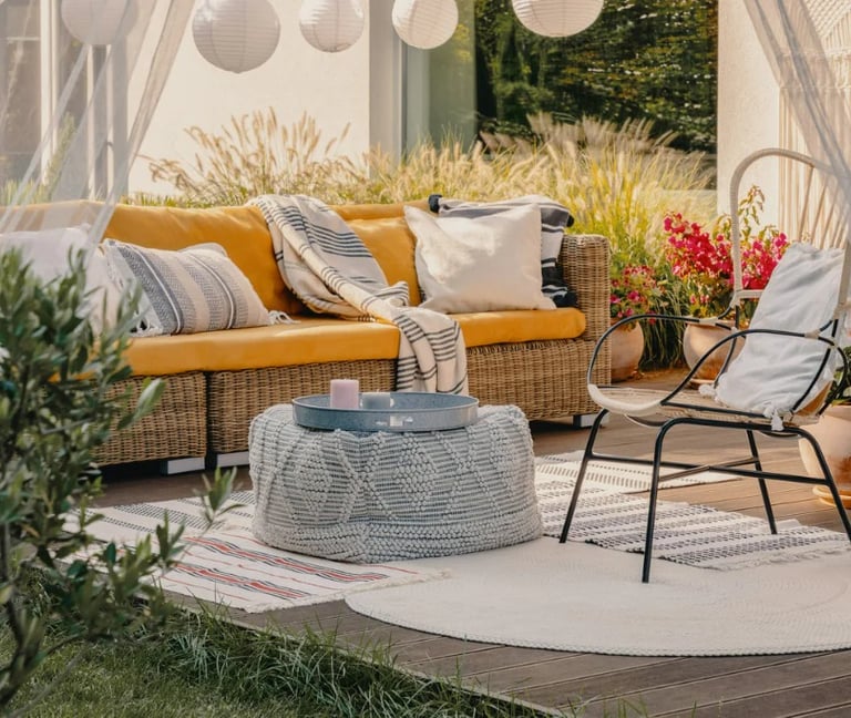 Boho outdoor spaces are relaxed, colorful, and full of texture. Layered fabrics, plants, and natural materials create a cozy atmosphere perfect for lounging.