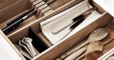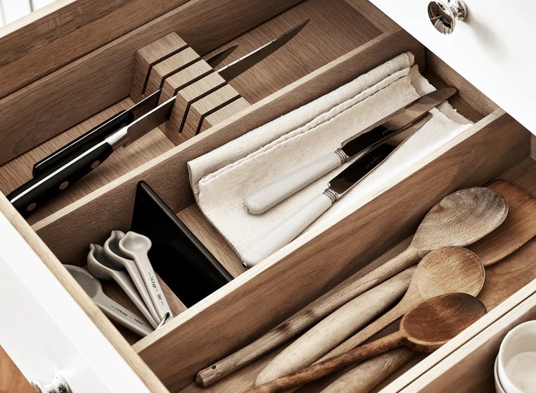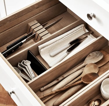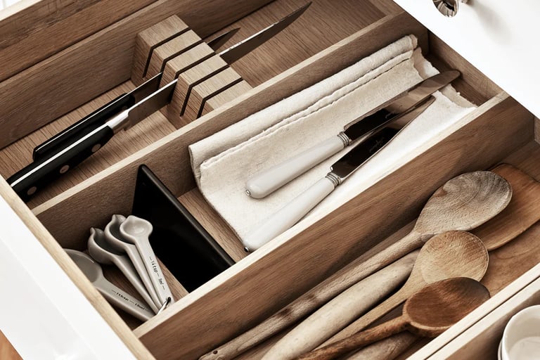 Messy drawers = wasted space. Use dividers to sort utensils, knives, and gadgets so you can find what you need instantly. Bonus tip: adjustable bamboo or acrylic organizers keep everything customizable.
