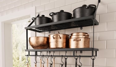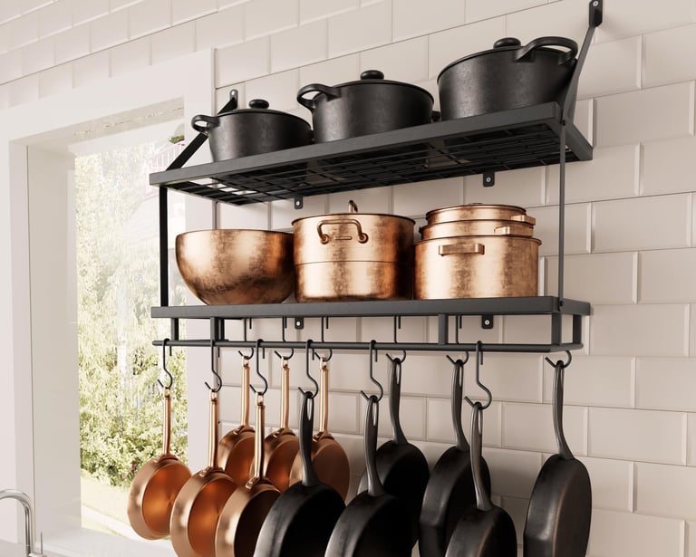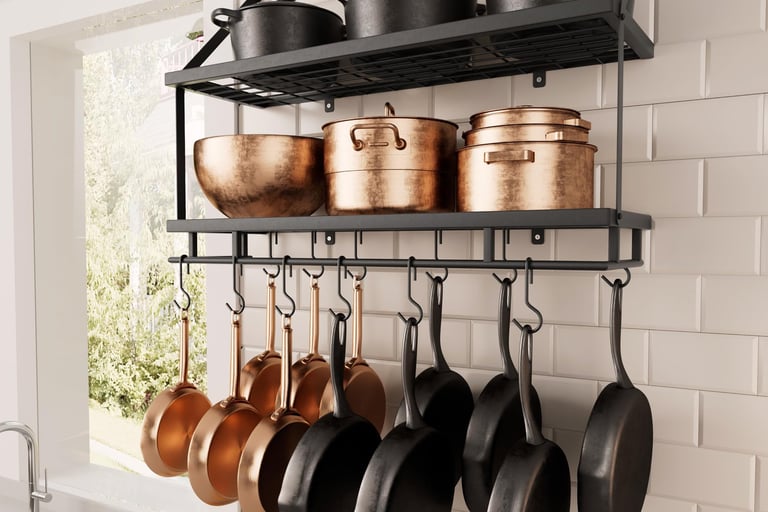 Add adhesive hooks inside cabinet doors for measuring spoons, oven mitts, or cutting boards. Install a rail with S-hooks for pots and pans—it saves cabinet space and adds a modern, chef-style vibe.