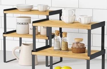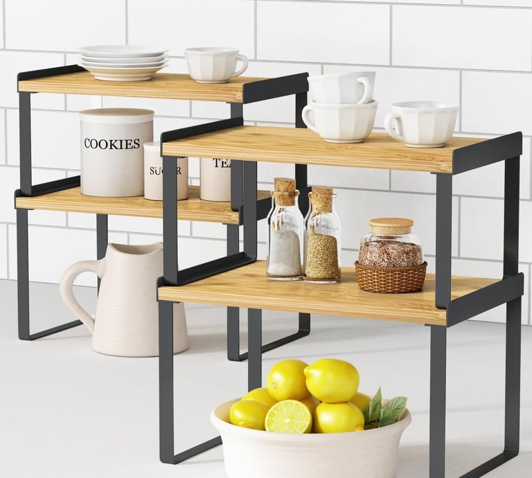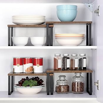 Use stackable shelf risers to add an extra layer inside cabinets. Suddenly, your plates, mugs, and bowls all have their own space without toppling over.