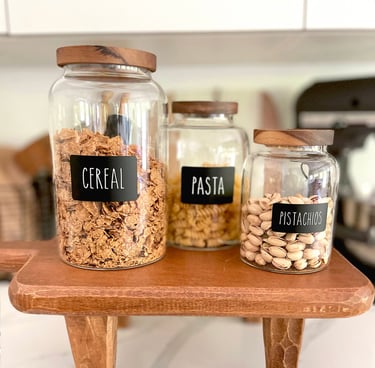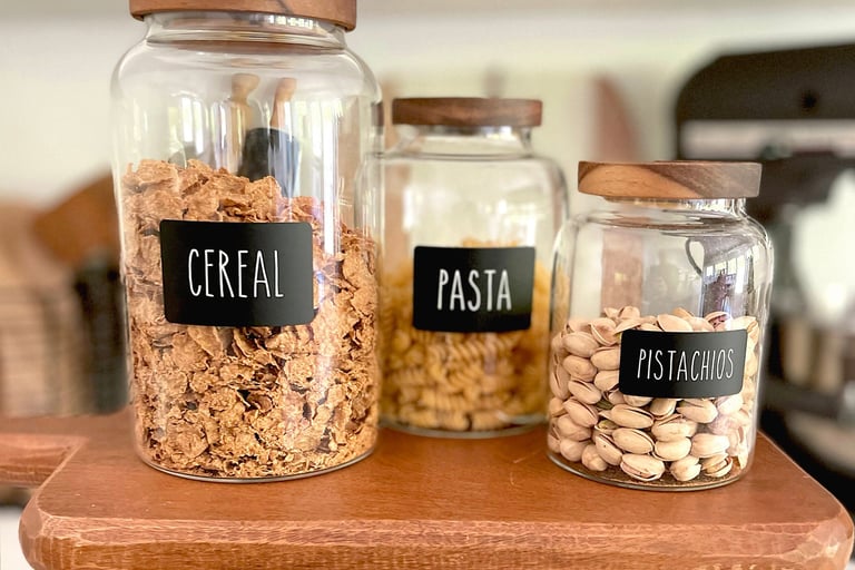Decant pantry staples like pasta, rice, and snacks into clear jars or bins. Not only do they look pretty, but you’ll also see exactly what you have at a glance. Add labels for that Pinterest-perfect touch.
