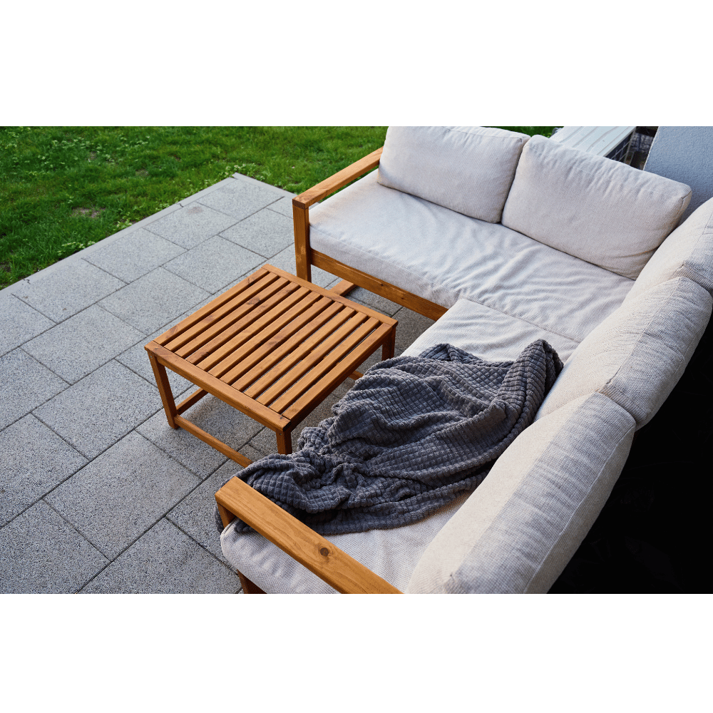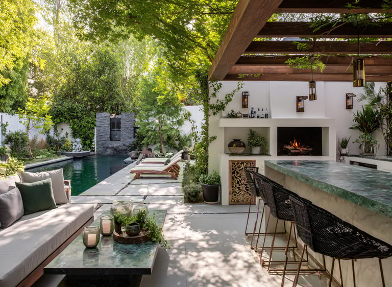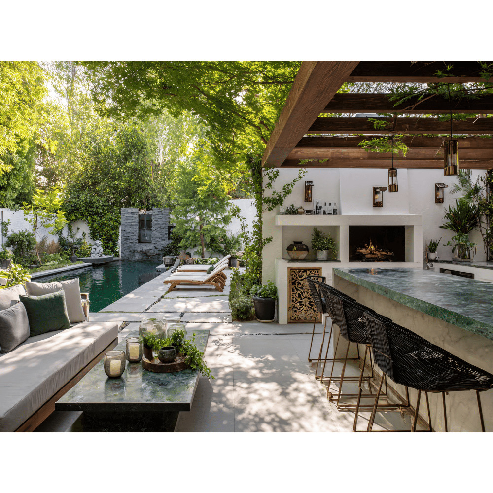 Choose weather-resistant fabrics that can handle sun, moisture, and spills. Don’t forget a shade solution — whether it’s a pergola, umbrella, or canopy — to keep the area enjoyable on sunny days.