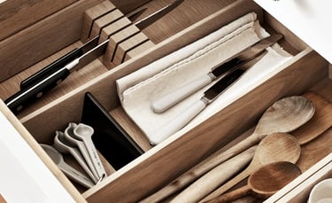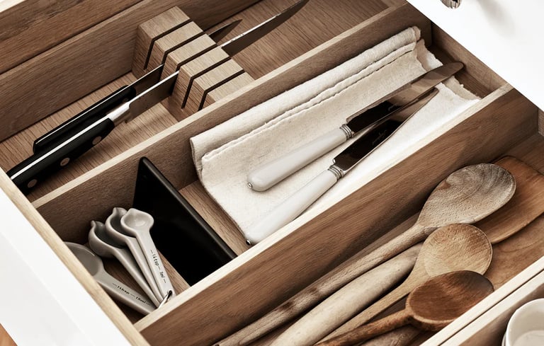 Messy drawers = wasted space. Use dividers to sort utensils, knives, and gadgets so you can find what you need instantly. Bonus tip: adjustable bamboo or acrylic organizers keep everything customizable.