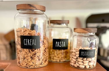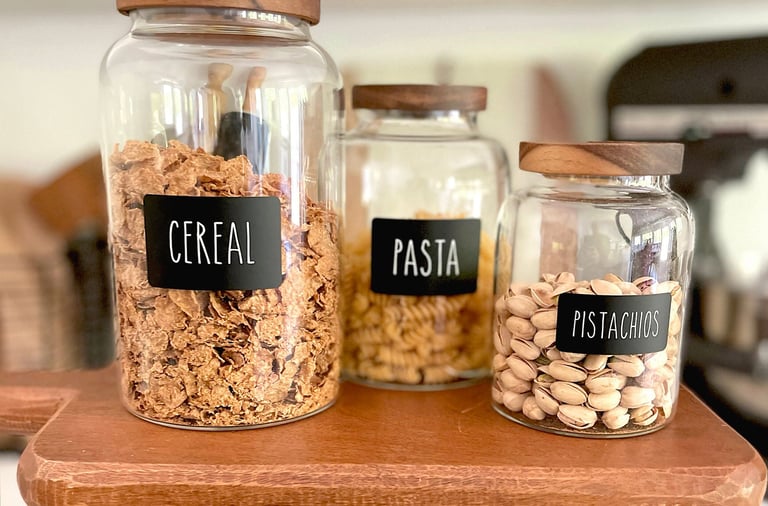 Decant pantry staples like pasta, rice, and snacks into clear jars or bins. Not only do they look pretty, but you’ll also see exactly what you have at a glance. Add labels for that Pinterest-perfect touch.