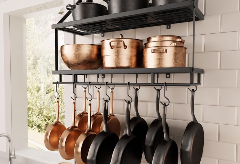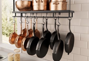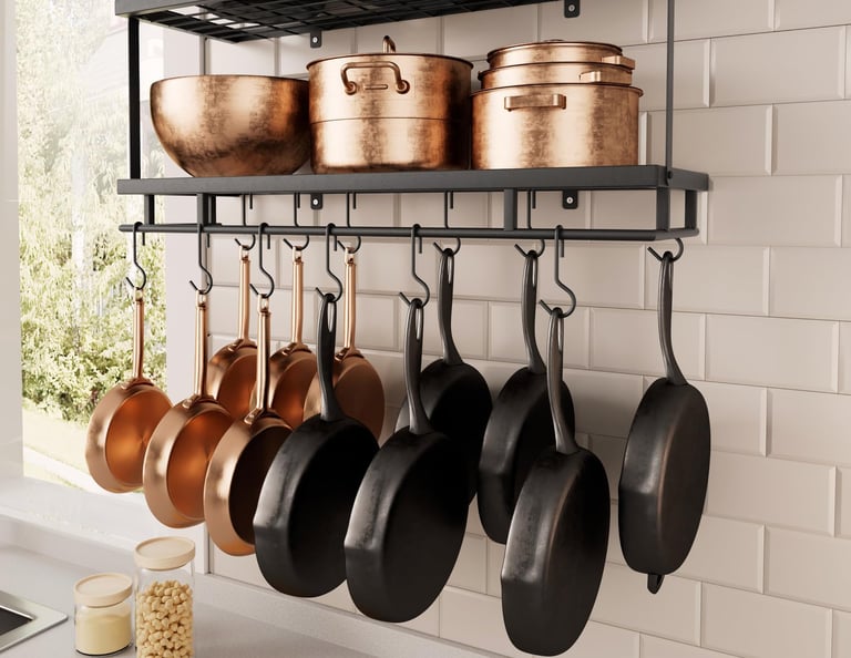 Add adhesive hooks inside cabinet doors for measuring spoons, oven mitts, or cutting boards. Install a rail with S-hooks for pots and pans—it saves cabinet space and adds a modern, chef-style vibe.