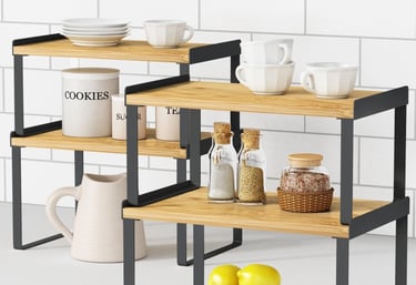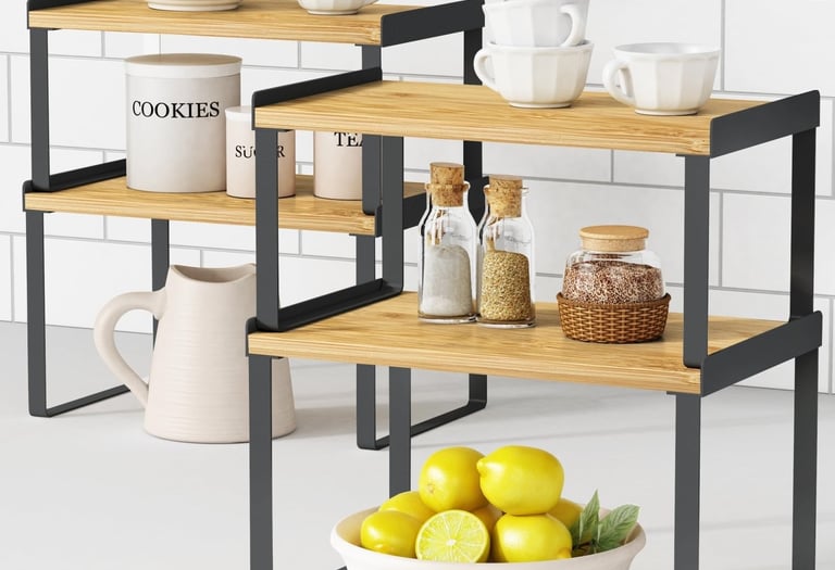 Use stackable shelf risers to add an extra layer inside cabinets. Suddenly, your plates, mugs, and bowls all have their own space without toppling over.